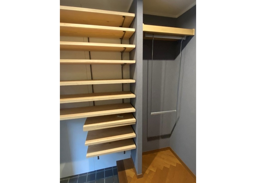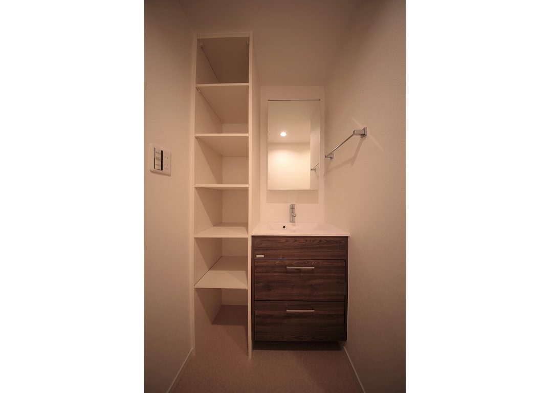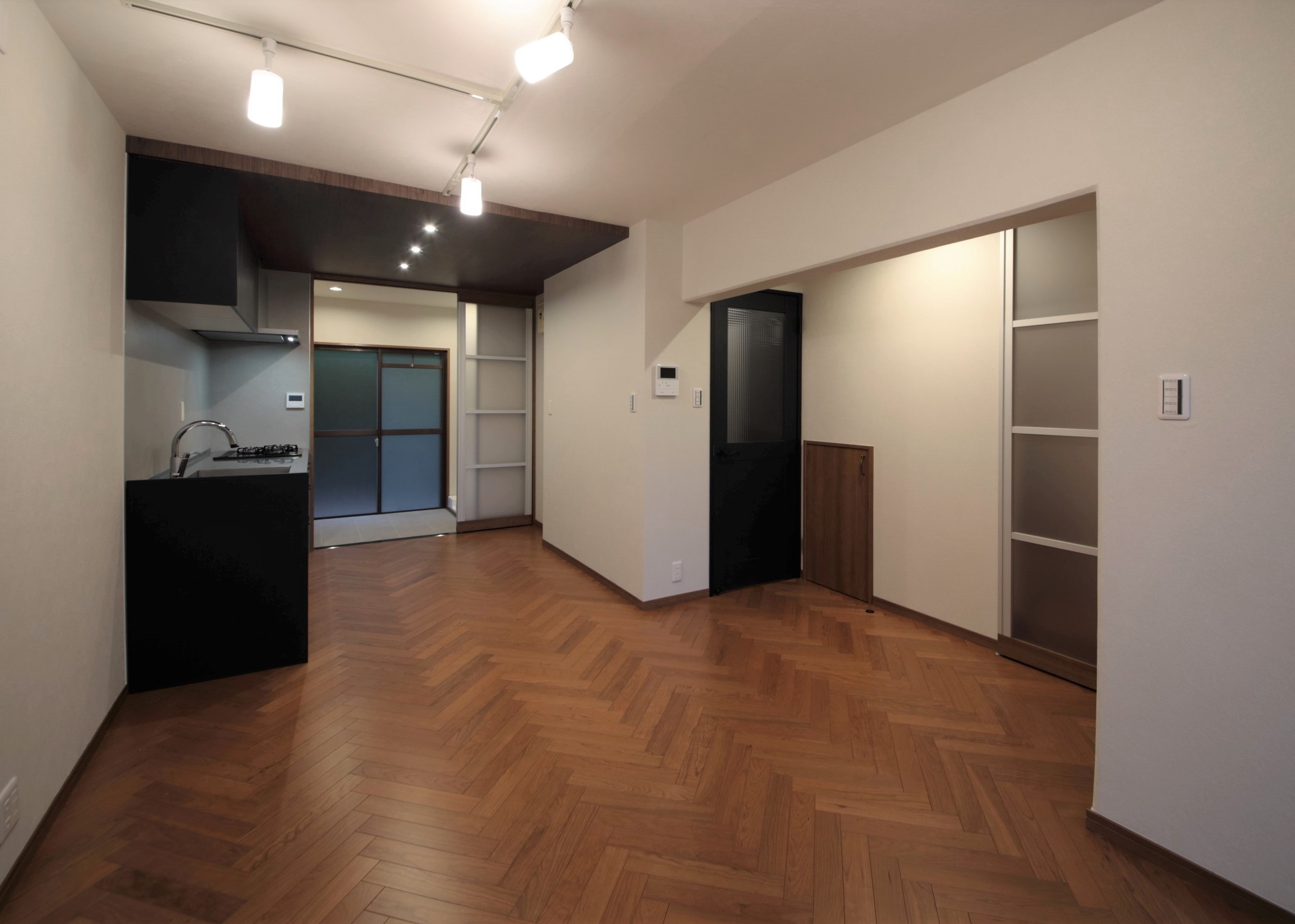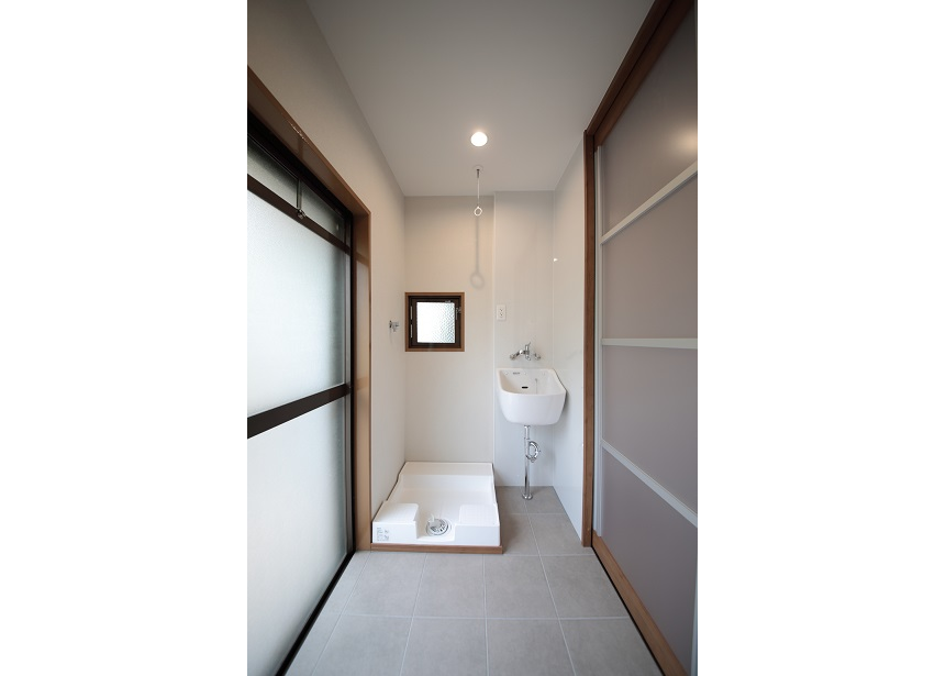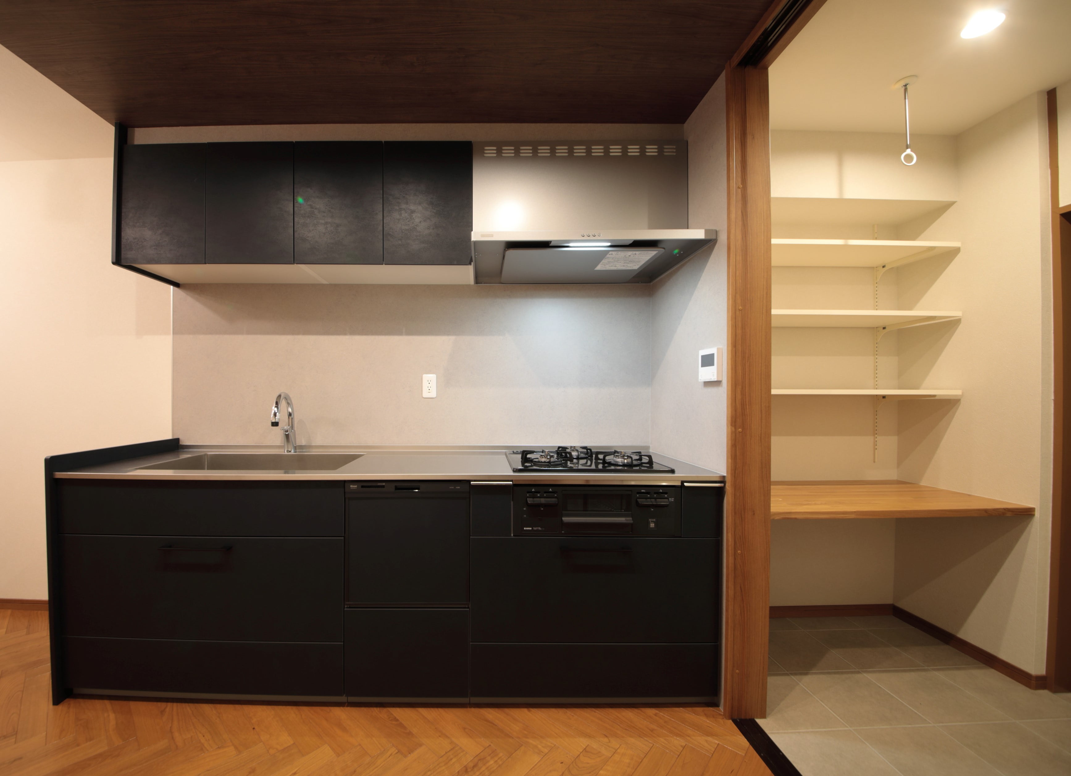 家事動線を考慮しキッチン横に家事コーナーを新設して、収納や洗濯ブースを確保。追い炊き配管を設置して、ユニットバスを設置。階段上部のデッドスペースに収納を設けるなど、室内を快適に過ごせる工夫を考えました。庭付き1-2Fなので、南側にはウッドデッキを設置して、開放的な見晴らしをグレードアップ。床や建具、配置など、古いものと新しいものの融和のできるデザインとしました。